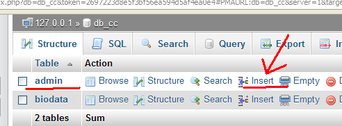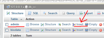 5. Klik Insert pada tabel admin dan isi kolom disebelah kanan terserah mau diisi apa, gambar dibawah sebagai contohnya
